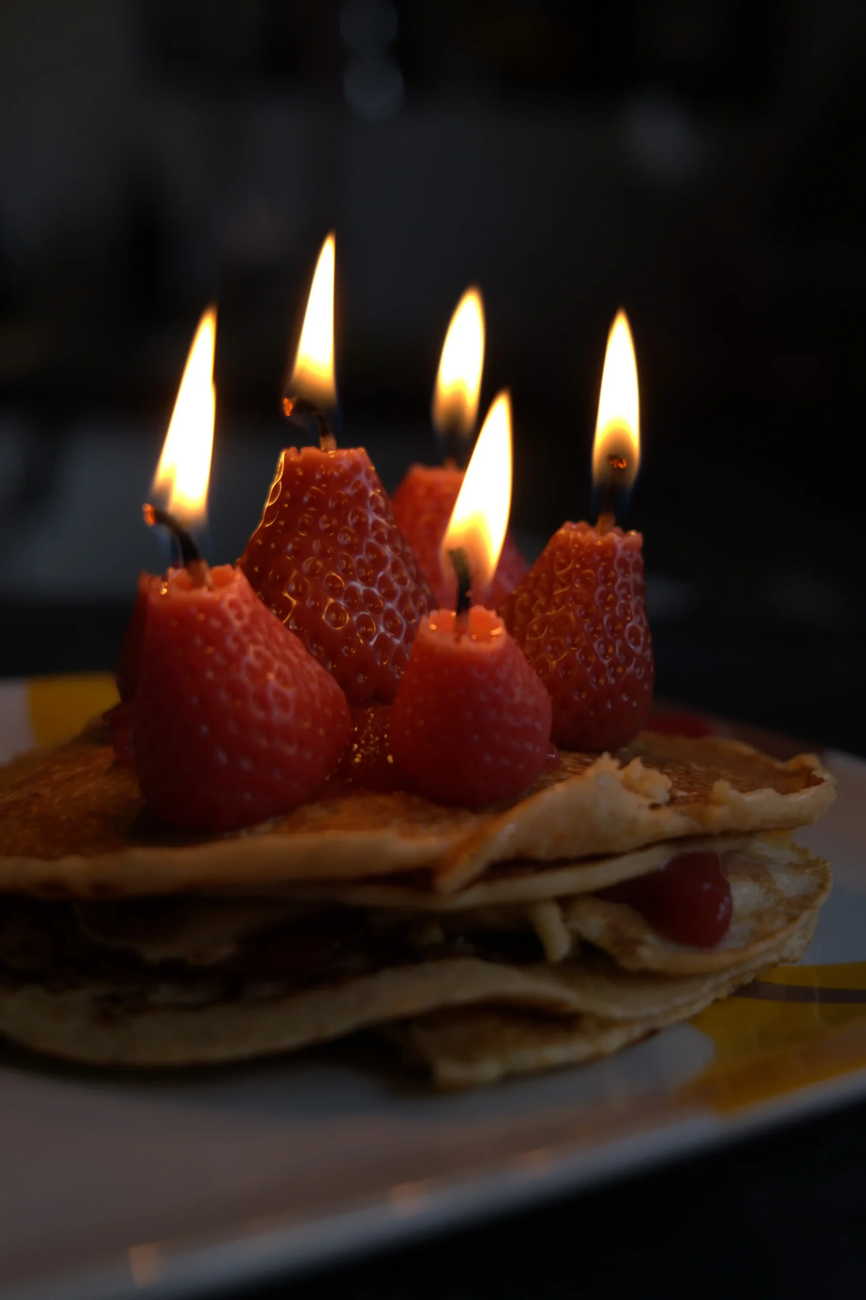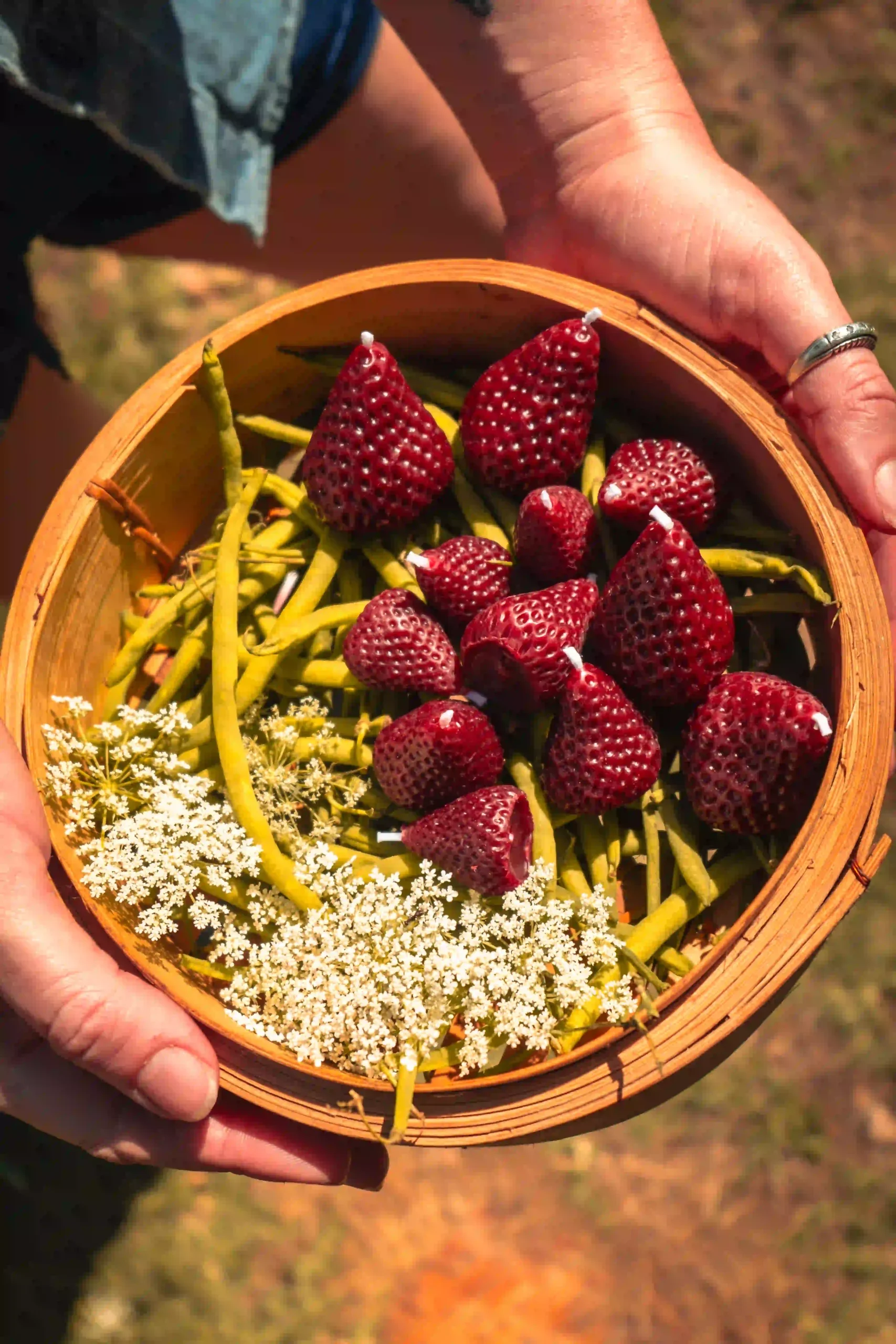 Velas en forma de fresitas para celebrar cumpleaños, hecha a mano con cera de abejas de apicultores locales. Vertida en moldes de silicona y moldeada para obtener los detalles, para el color se usaron pigmentos de tierra extraídos de raíces y verduras, sin químicos añadidos. El olor de la cera de abejas puede variar dependiendo de la temporada del año en que se coseche y de las flores que liben las abejas.