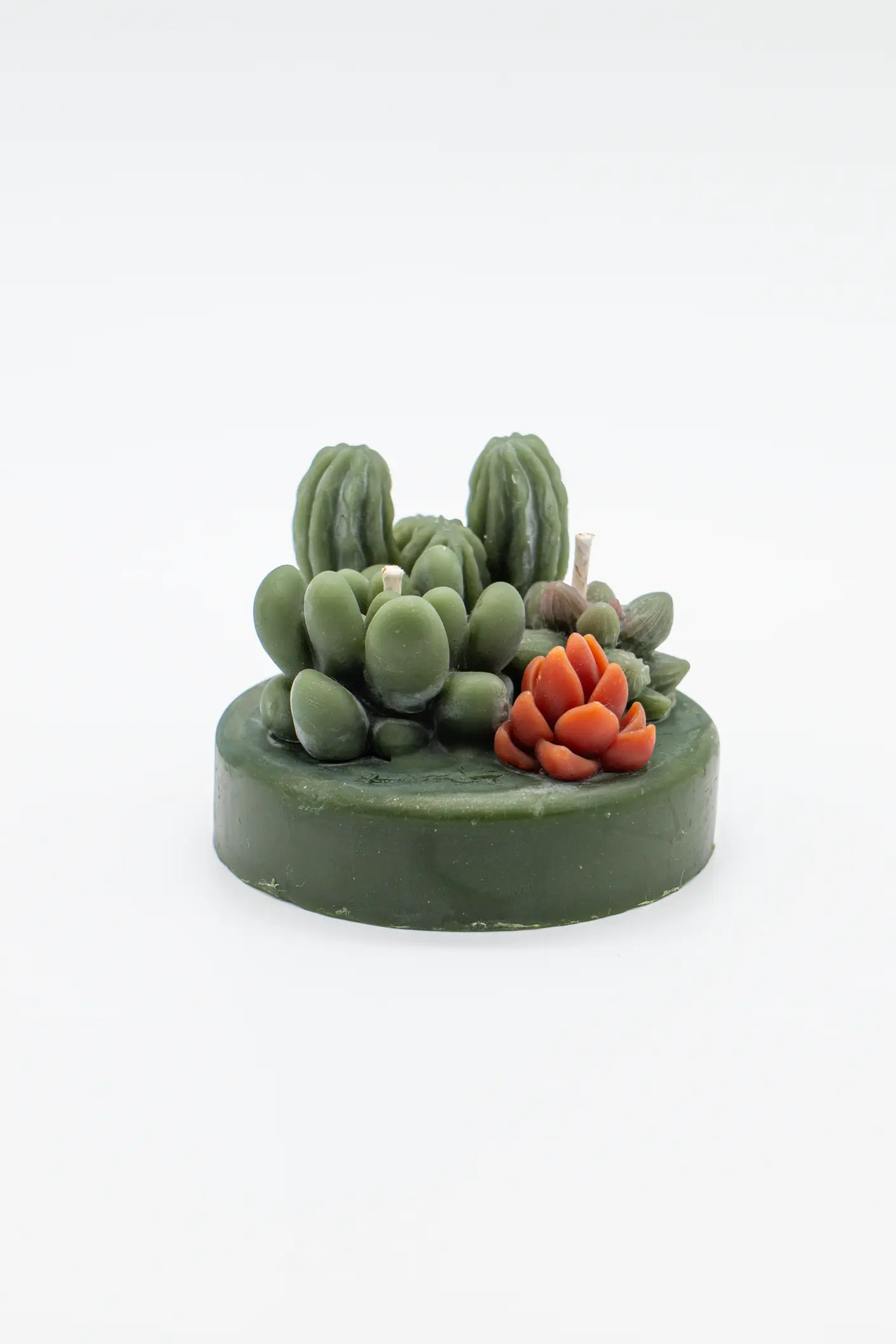 Gaia, un homenaje a la madre tierra en forma de vela. Cada cactus y suculenta de este terrario está esculpido a mano en cera de abeja, creando un paisaje único. Es la pieza perfecta para quienes aman las plantas. Un oasis de diseño que decora tu refugio con el aroma de la naturaleza más pura.