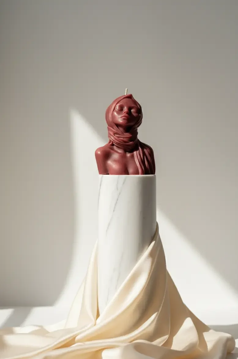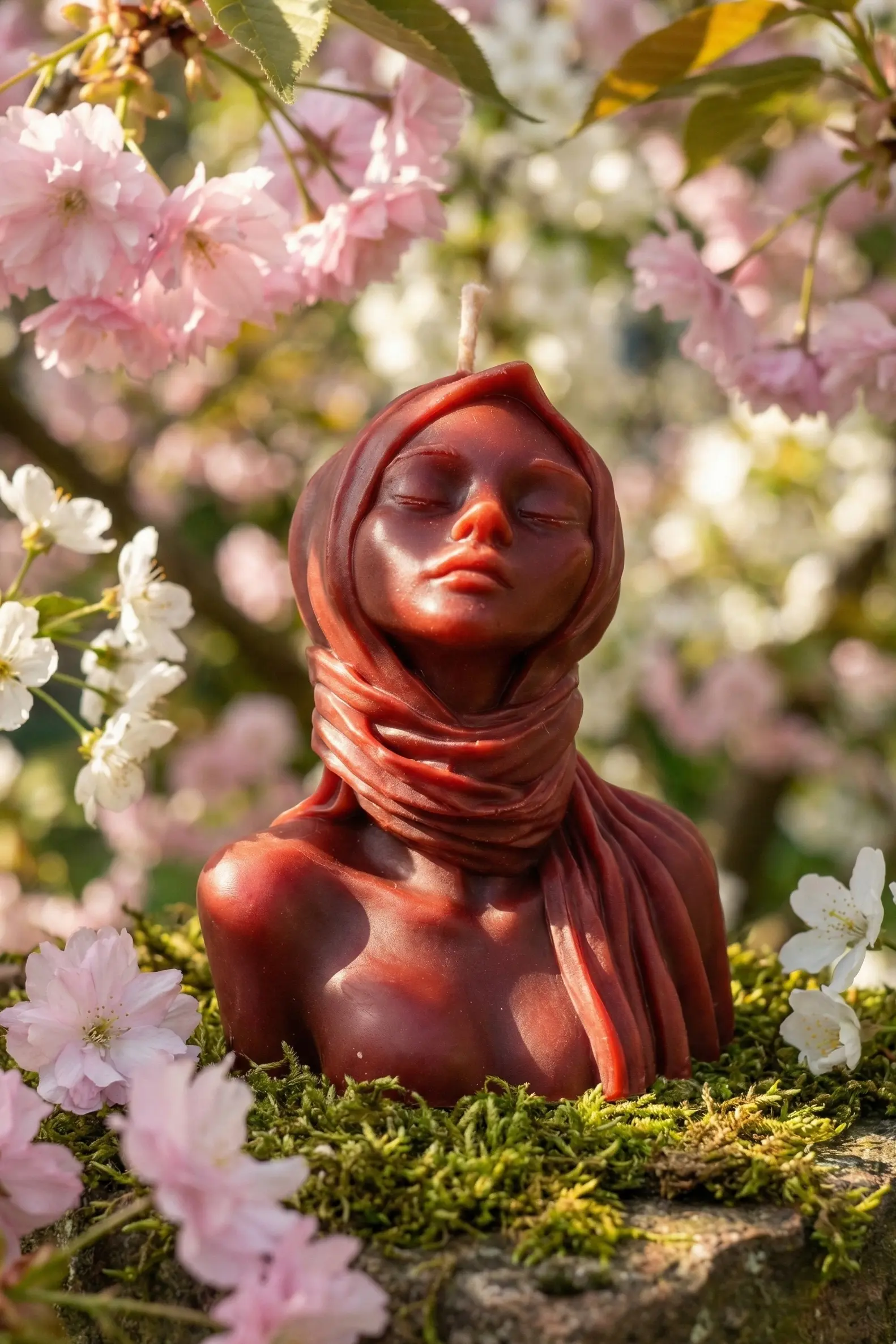 Vela en forma de busto de mujer con pañuelo en la cabeza, hecha a mano con cera de abejas de apicultores locales. Vertida en moldes de silicona y moldeada para obtener los detalles, para el color se usaron pigmentos de tierra extraídos de raíces y verduras, sin químicos añadidos. El olor de la cera de abejas puede variar dependiendo de la temporada del año en que se coseche y de las flores que liben las abejas.