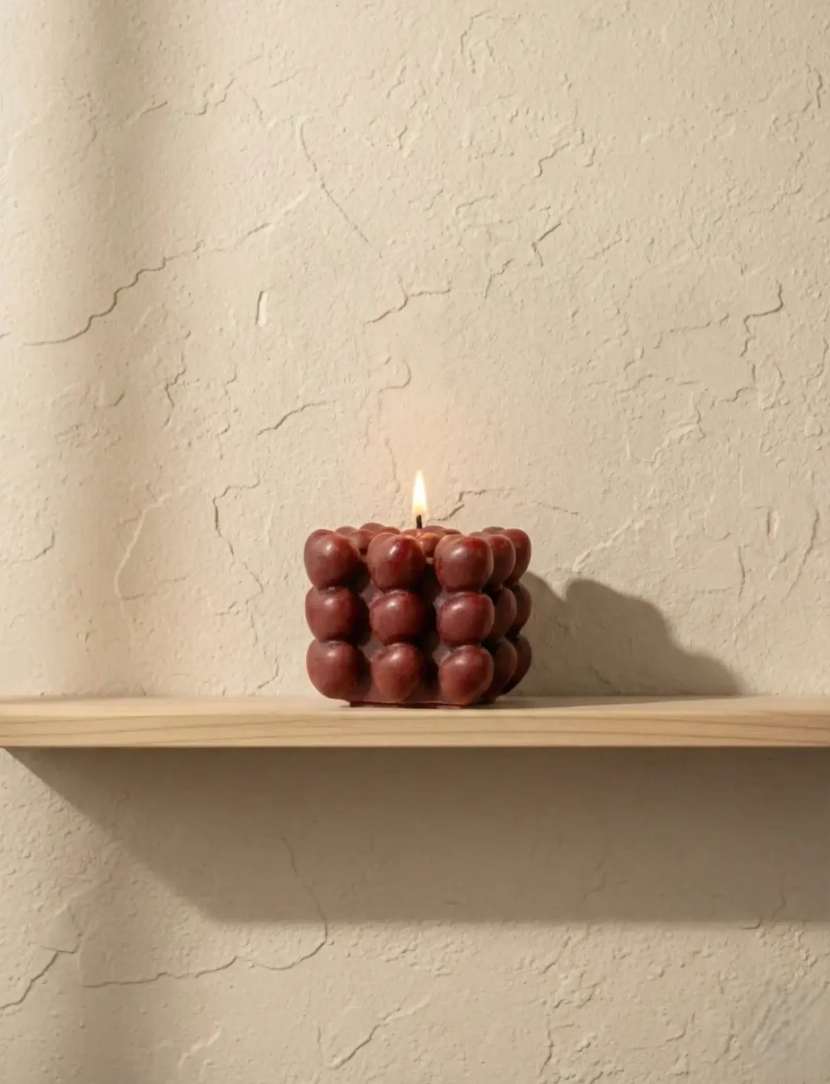 Vela en forma de cubo geométrico rodeado de corazones, hecha a mano con cera de abejas de apicultores locales. Vertida en moldes de silicona y moldeada para obtener los detalles, para el color se usaron pigmentos de tierra extraídos de raíces y verduras, sin químicos añadidos. El olor de la cera de abejas puede variar dependiendo de la temporada del año en que se coseche y de las flores que liben las abejas.