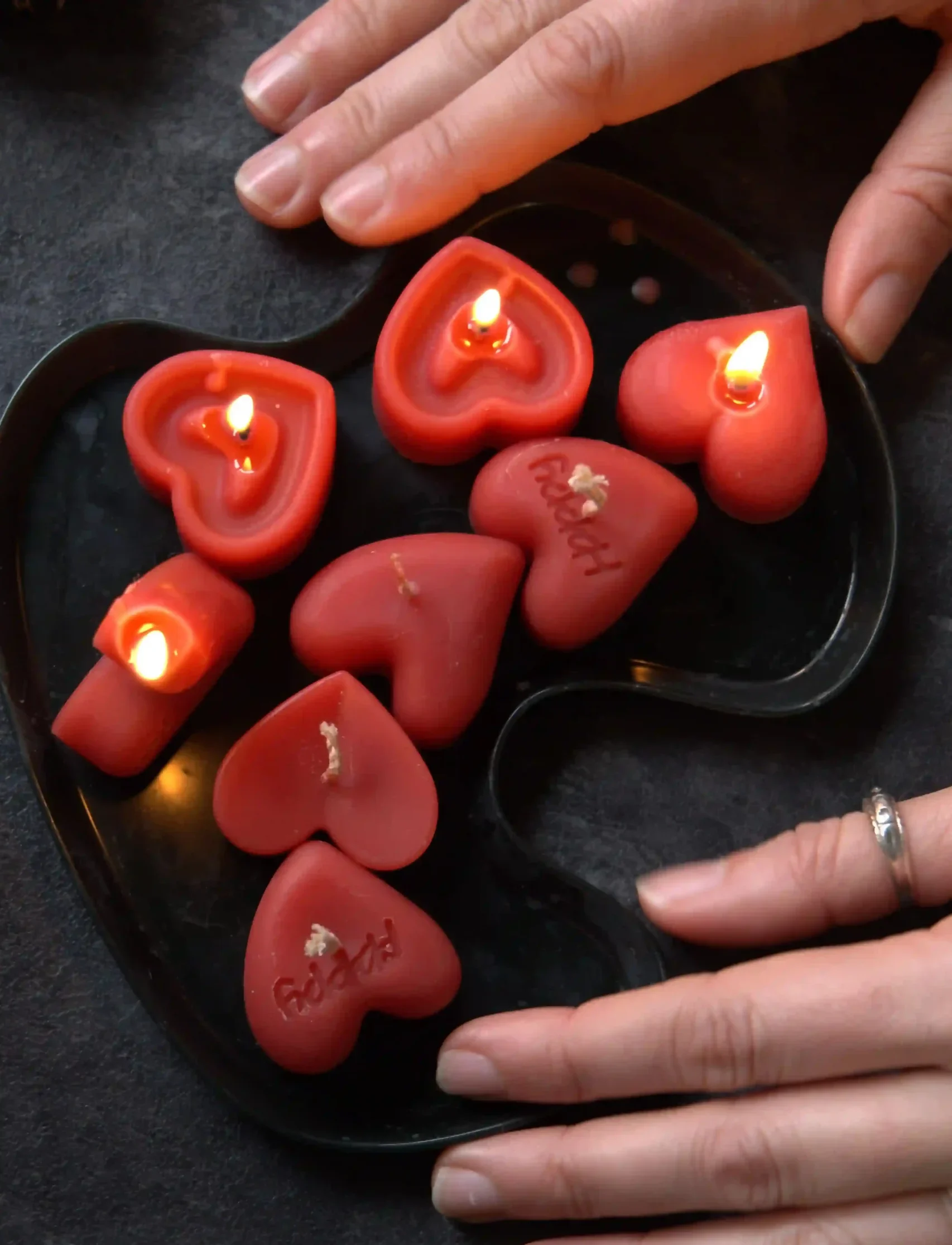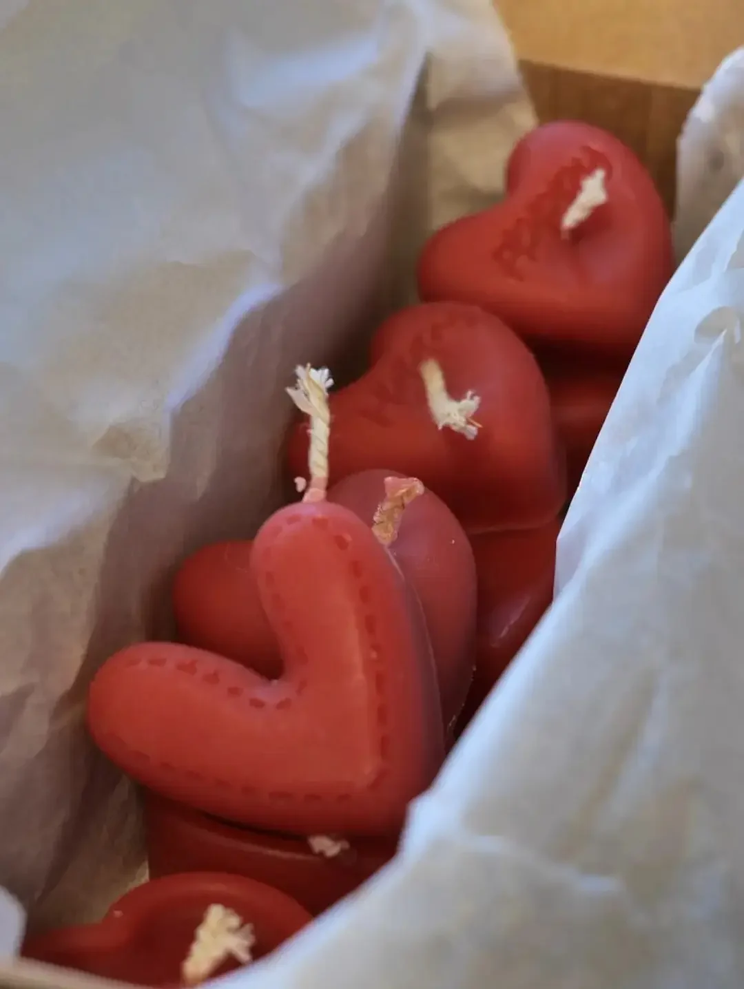 Pack de 9 Velas en forma de corazones de diferentes modelos, hechas a mano con cera de abejas de apicultores locales. Vertida en moldes de silicona y moldeada para obtener los detalles, para el color se usaron pigmentos de tierra extraídos de raíces y verduras, sin químicos añadidos. El olor de la cera de abejas puede variar dependiendo de la temporada del año en que se coseche y de las flores que liben las abejas.